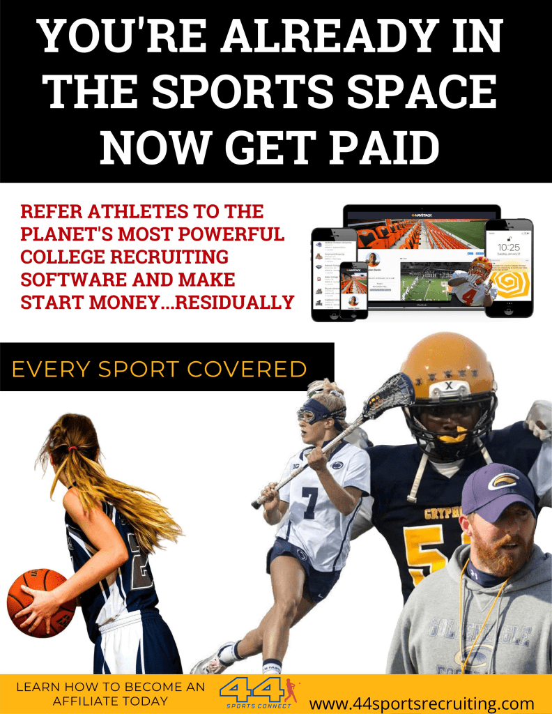 With our new 44 Sports Recruiting Website and our amazing Software Access we now offer an Affiliate Program that can help you bring in some extra income. Wether your a coach, trainer that wants to bring extra value to helping your Athletes Go to next level of playing in College or you are Student Athlete or a Parent that want to help other Athletes and families in their recruiting process. This is a great program and product that can impact a young athletes future in an amazing way and bring in an extra income. If Interested in finding out more please contact me at 44 Sports Recruiting